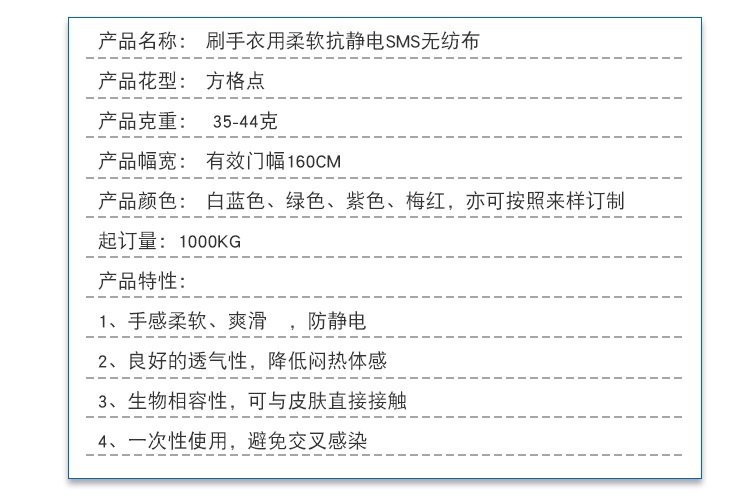 產品摘要:品質標準 中國紡織行業標準(FZ) 主要成分 無紡布 幅寬 有效門幅160cm 克重 35-44克(g/㎡) 成網方式 紡絲 主要用途 醫療衛生用布,家居家紡用布,收納、包裝用布 貨號 19 成分及